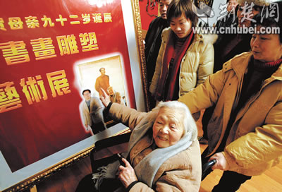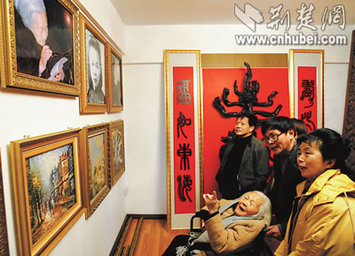 “這是特意為您準備的生日禮物!”年過六旬的盧永瀚攙扶著92歲的母親,在根雕、油畫面前仔細講解!斑@個根雕是壽字!”孫女插話說:“就是祝您長壽,活過100歲!”慧老太太邊看邊比劃著,樂得合不攏嘴,用濃重的江浙口音說:“好、好!”