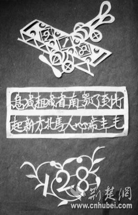 中國剪紙起源于裝飾藝術(shù)。樣式有窗花、燈花、喜花以及鞋墊花等。其中用來制作繡花底樣的雕花剪紙又名“花樣”,主要是供婦女刺繡使用的圖案底稿,大多是與民眾日常生活關(guān)系密切的傳統(tǒng)圖案。此次發(fā)現(xiàn)反映抗戰(zhàn)主題的50多張花樣剪紙,從構(gòu)圖、技法上看,比較稚嫩、粗糙,但充分體現(xiàn)了藝人們的創(chuàng)新精神。其中最顯眼的是一張邊緣殘缺、破舊的黃裱紙,上面依稀可見“兒童團(tuán)”三個字,是唯一的一張剪紙原稿。葉家慶介紹,寫著“打到了鄂南省減租減息,毛主席心(新)人馬北方新起”(如左圖)的花樣,從內(nèi)容分析,反映了1944年新四軍各軍區(qū)對日偽軍發(fā)動春夏秋季攻勢,并粉碎日偽軍反撲,解放國土、人口,改善華中各抗日根據(jù)地的斗爭形勢。