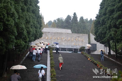 進門后,展現在人們眼前的是109級臺階,威嚴肅穆的紀念堂就矗立在山頂上。導游小姐告訴記者,這些臺階分為兩組,第一組49級,象征1949年新中國成立。第二組60級,寓意陵園是在井岡山革命根據地創(chuàng)建六十周年的1987年建成。