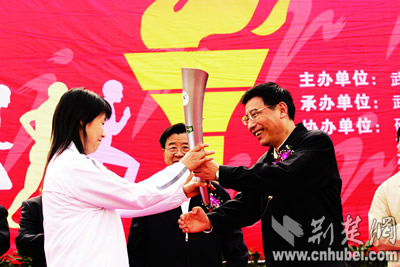 昨日8時(shí)30分許,硚口體育廣場彩旗飄揚(yáng)、鑼鼓喧天。省委常委、武漢市委書記苗圩點(diǎn)燃武漢市第七屆運(yùn)動(dòng)會(huì)火種,交由奧運(yùn)冠軍喬紅引燃各區(qū)火炬,領(lǐng)跑該市近5000人的火炬大傳遞。