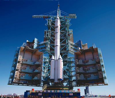 長征二號(hào)F型火箭等待著它的第6次飛行。兩小時(shí)45分鐘前,執(zhí)行神舟六號(hào)載人航天飛行任務(wù)的航天員費(fèi)俊龍和聶海勝進(jìn)入飛船返回艙,“神箭”和“神舟”第一次迎來了兩名乘客。