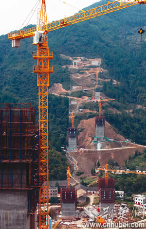 龍?zhí)逗犹卮髽蚓o鄰長(zhǎng)陽(yáng)縣榔坪鎮(zhèn),是滬蓉西高速公路上一座T構(gòu)箱梁橋,主橋墩最高178米,居世界同類(lèi)橋高墩之最。“見(jiàn)過(guò)這么高的塔吊沒(méi)?”戴上安全帽,湖北路橋公司項(xiàng)目經(jīng)理夏君華帶記者一行踏訪工地。