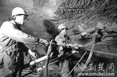 穿著雨衣的工人們手持風(fēng)槍,正在腳手架上下打爆破眼,山體里的水嘩啦啦直往下噴,然后順著挖好的水槽排向洞外,最多時(shí)一天要排3000立方米!斑@水算小的!”也許是察覺(jué)出我們眼神里的擔(dān)心,包秀峰輕松笑笑,仿佛一切都在他們掌控中。他甚至調(diào)侃說(shuō),“瞧,我們都穿皮鞋上班,施工環(huán)境沒(méi)你們想象中那么艱難!