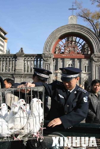 11月15日,北京市東城區(qū)城管隊員在王府井教堂的廣場前拉起一張捕鳥網(wǎng),捕捉廣場附近的野鴿子。這些野鴿子將被送到信鴿協(xié)會在昌平設(shè)立的鴿舍,待禽流感疫情解除后,再放回廣場。 新華社發(fā)(吳強 攝)