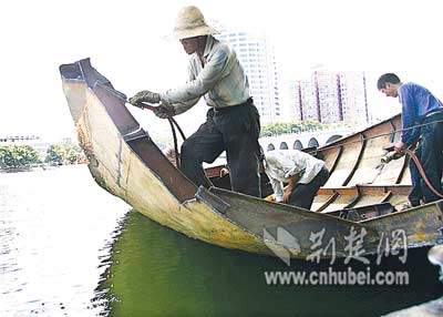 “船太大了,沒辦法運出城,只好進行分解后運走!必撠(zé)現(xiàn)場施工的馬先生解釋,2002年初,他所在的公司承攬東湖清淤工程,共運來8條清淤船,其中一條船放置在水果湖。當時,經(jīng)有關(guān)部門批準,這些船由大型車輛運來并吊入湖中。目前清淤工程結(jié)束,湖中的船不好運走,只好割成一塊塊鋼板,當成廢鋼賣掉。