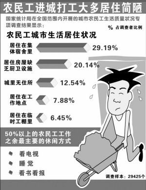 此外,農(nóng)民工生活質(zhì)量普遍不高。首先是農(nóng)民工生活、衛(wèi)生條件差。受工資水平低限制,大部分農(nóng)民工的月消費(fèi)幾乎全部用于住宿和食品消費(fèi),而在生病時(shí),只有少數(shù)人會選擇去正規(guī)醫(yī)院,其他人大都選擇自己買藥治療或去個(gè)體診所。其次是居住環(huán)境質(zhì)量差。近40%的農(nóng)民工居住在工棚或集體宿舍里,地方狹窄擁擠,室內(nèi)骯臟零亂,除了被褥衣物,幾無他物。