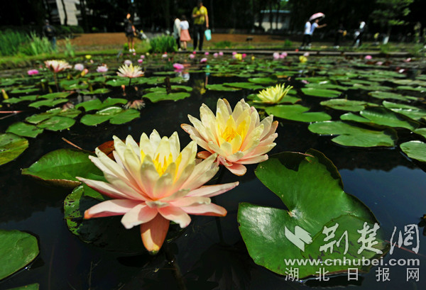 睡蓮展示區(qū),“水中女神”已經(jīng)蘇醒,進入超長花期。印度紅睡蓮、埃及藍睡蓮、墨西哥黃睡蓮、中國延藥睡蓮、泰國招財女神……武漢植物園睡蓮池臥虎藏龍,展示著世界各地的睡蓮名品。仿造睡蓮花瓣建造成的“八色睡蓮池”已經(jīng)上色完畢,紫、藍、黃、粉、紅,色彩大膽絢爛,如意蘊流淌的藝術(shù)家畫作。