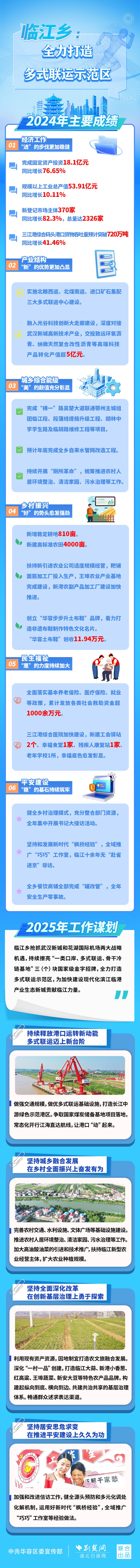 2024年,臨江鄉(xiāng)圍繞打造多式聯(lián)運示范區(qū)發(fā)展目標(biāo),全年各項目標(biāo)任務(wù)取得新成效。2025年,臨江鄉(xiāng)如何全力打造多式聯(lián)運示范區(qū)?荊楚網(wǎng)(湖北日報網(wǎng))帶您一圖速覽。