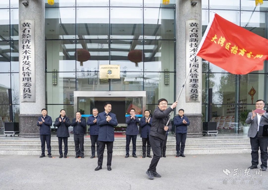 “期待你們凱旋而歸,出征!”授旗儀式上,黃石經(jīng)濟(jì)技術(shù)開發(fā)區(qū)黨工委書記、管委會(huì)主任、鐵山區(qū)委書記萬(wàn)鼎為大灣區(qū)招商分局、三角招商分局、武漢招商分局、鐵山街道招商專班授旗,4名招商專班負(fù)責(zé)人鄭重接過(guò)旗幟。
