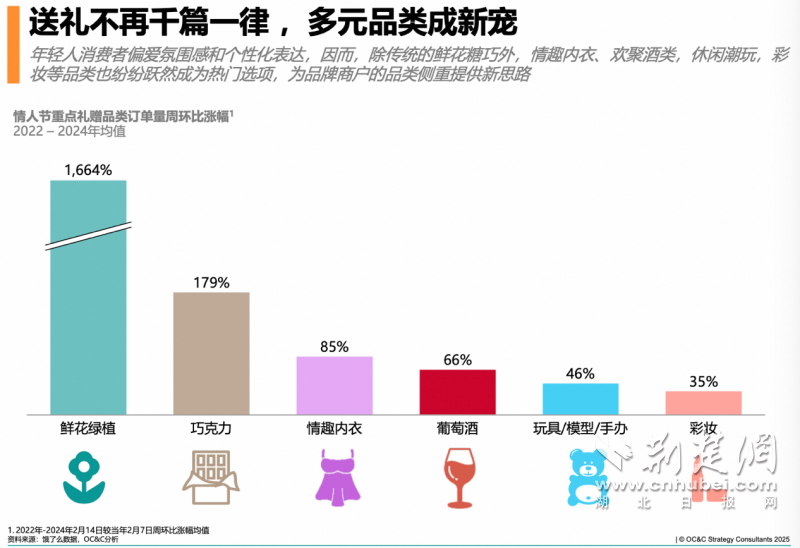 荊楚網(wǎng)(湖北日報網(wǎng))訊(通訊員 易曄)元宵才過,情人節(jié)接檔。零售品牌商戶們毫不猶豫步入下一個生意高峰,過節(jié)的愛人們也不慌不忙在節(jié)日當(dāng)天開始籌備浪漫表達(dá)。近日,餓了么聯(lián)合戰(zhàn)略咨詢公司OC&C共同發(fā)布的《情人節(jié)即時零售禮贈趨勢與品類機(jī)遇洞察》顯示,過去三年情人節(jié)當(dāng)天,重點禮贈品類的外賣單量較12日環(huán)比增長超過3倍,且當(dāng)日送禮訂單在晚間(17-21點)需求持續(xù)增長。