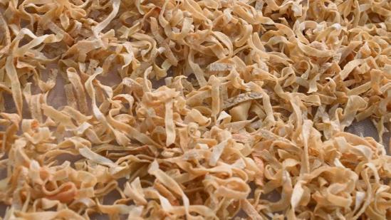 黃陂豆絲用蚌殼來制作,主要是為了攤平面糊。蚌殼材質(zhì)輕盈,便于操作使用,且蚌殼弧形的角度與農(nóng)家土灶用的鍋,貼合度高,攤出來的豆絲厚薄均勻。