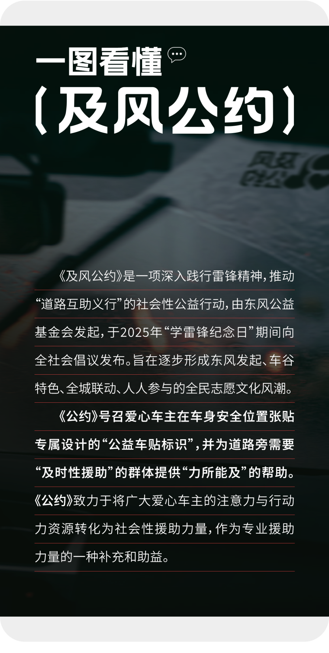 今天,我們以車輪為筆,重新書寫新時(shí)代的雷鋒日記。當(dāng)千萬車主的點(diǎn)滴善意匯成江河,這股東風(fēng)必將升騰而起,讓“及風(fēng)行動(dòng)”成為新時(shí)代向上向善的生動(dòng)注腳!