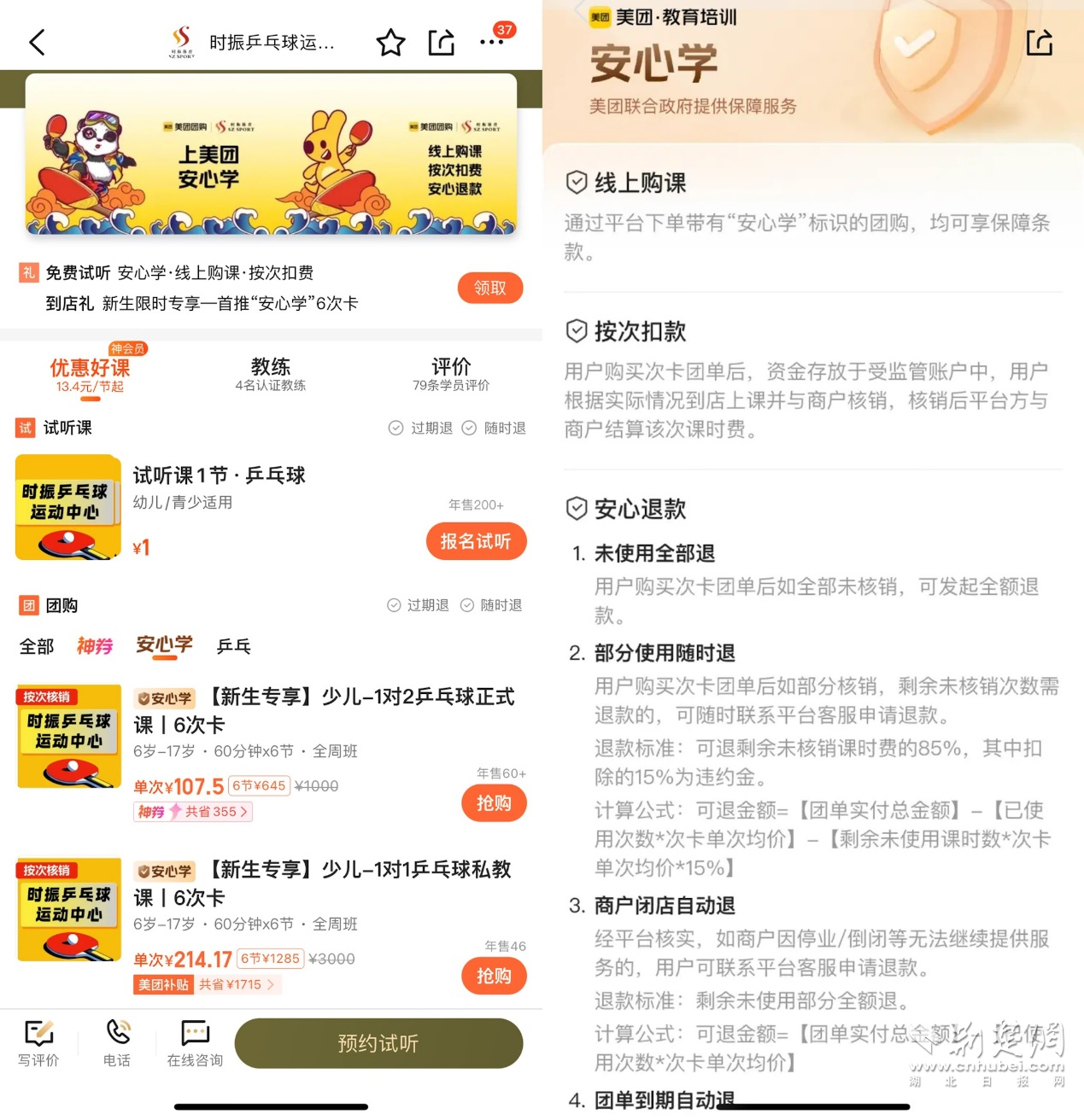 據(jù)了解,“安心學”是美團聯(lián)合各地政府部門,面向教育培訓領(lǐng)域創(chuàng)新推出的履約交易保障新模式,主要依托平臺的多次卡團購產(chǎn)品,在運動培訓、書法、科學探索、棋藝、美術(shù)、國學、音樂等非學科類培訓品類推出按次扣費的短期課,給消費者提供靈活、可靠的消費保障。