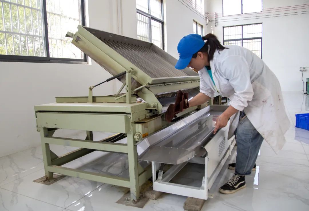 在距離木蘭湖20公里外的蔡家榨街道,綿陽山茶樹種植專業(yè)合作社內(nèi)千余平方米的制茶車間機械運轉(zhuǎn)轟鳴。自動生產(chǎn)線正將鮮葉轉(zhuǎn)化為精品茶,智能化監(jiān)測屏實時跳動殺青溫度和時間,身著白色工服的技師穿梭調(diào)試設(shè)備,茶青在傳送帶上翻滾、定型,濃郁的茶香的在空氣中彌漫。