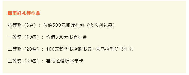 優(yōu)秀作品將獲新華書店購(gòu)書券、喜馬拉雅聽書年卡、智能地球儀等獎(jiǎng)勵(lì),并在官方平臺(tái)展播!