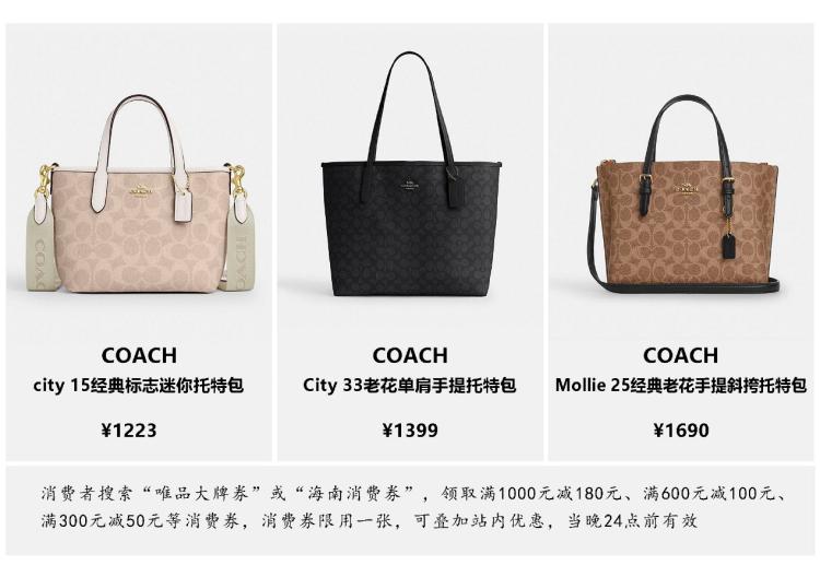 折扣不止于此,當天上午10點,消費者搜索“唯品大牌券”或“海南消費券”,可搶滿1000元減180元、滿600元減100元、滿300元減50元等消費券,消費券限用一張,當晚24點前有效,可以和當天活動優(yōu)惠疊加使用——甚至還能用于五糧液等名酒。算下來,Coach爆款托特包甚至僅為千元左右。
