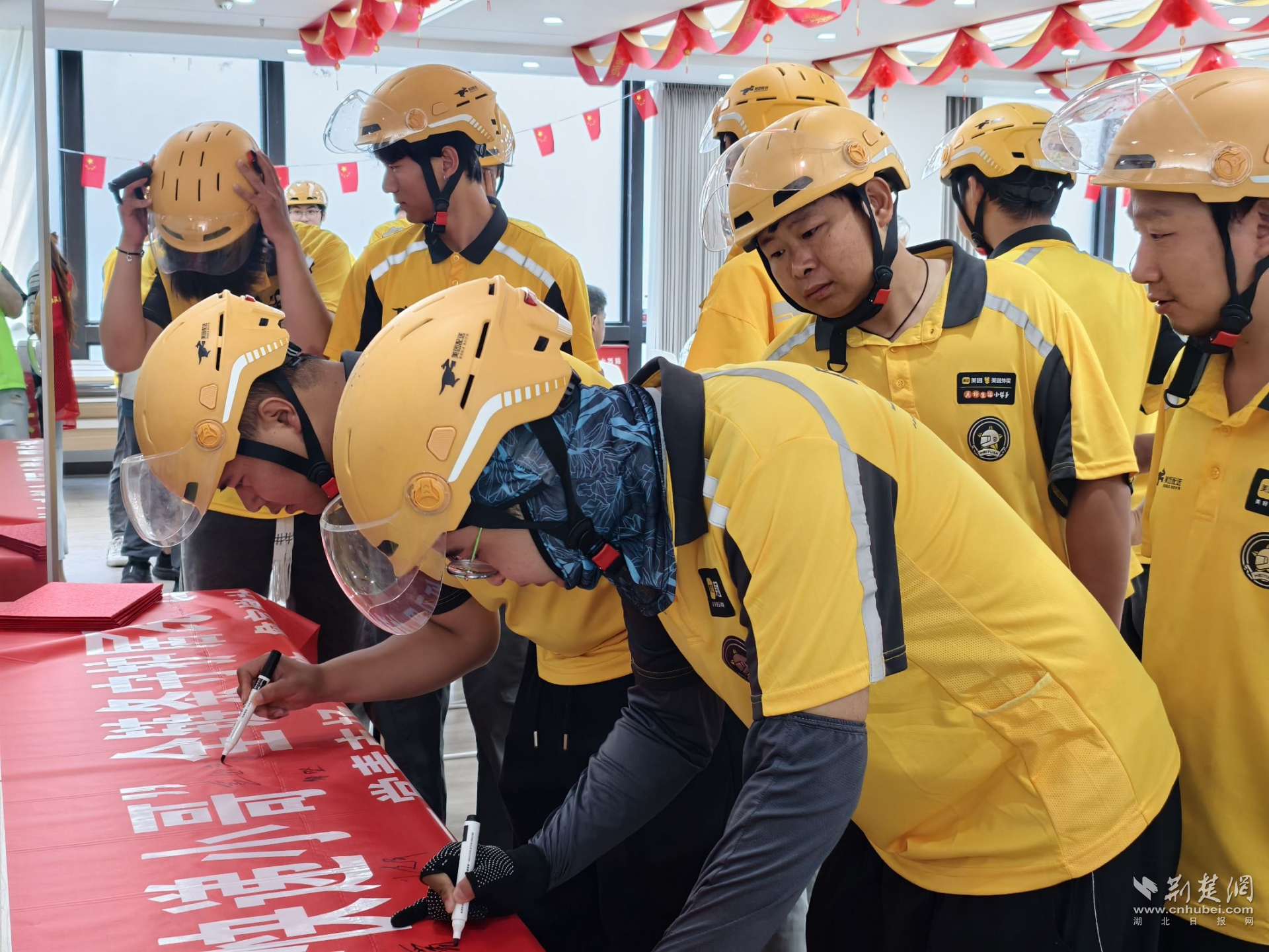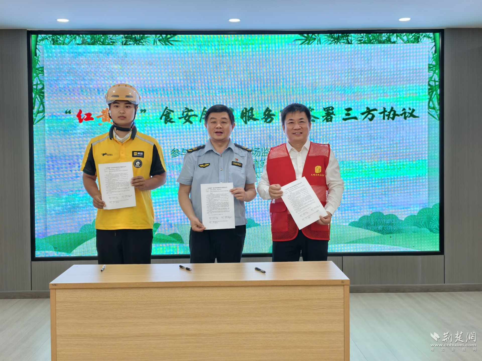 活動(dòng)現(xiàn)場,江漢區(qū)“紅黃藍(lán)”食安鄰里服務(wù)隊(duì)正式成立,由市場監(jiān)管干部、新就業(yè)群體、社區(qū)志愿者三方共建協(xié)同,首批成員包括美團(tuán)金家墩站點(diǎn)配送騎手。服務(wù)隊(duì)將立足居民區(qū),圍繞食品安全宣傳、應(yīng)急響應(yīng)、信息聯(lián)動(dòng)等方面提供志愿支持,為守護(hù)“舌尖上的安全”注入多元活力。