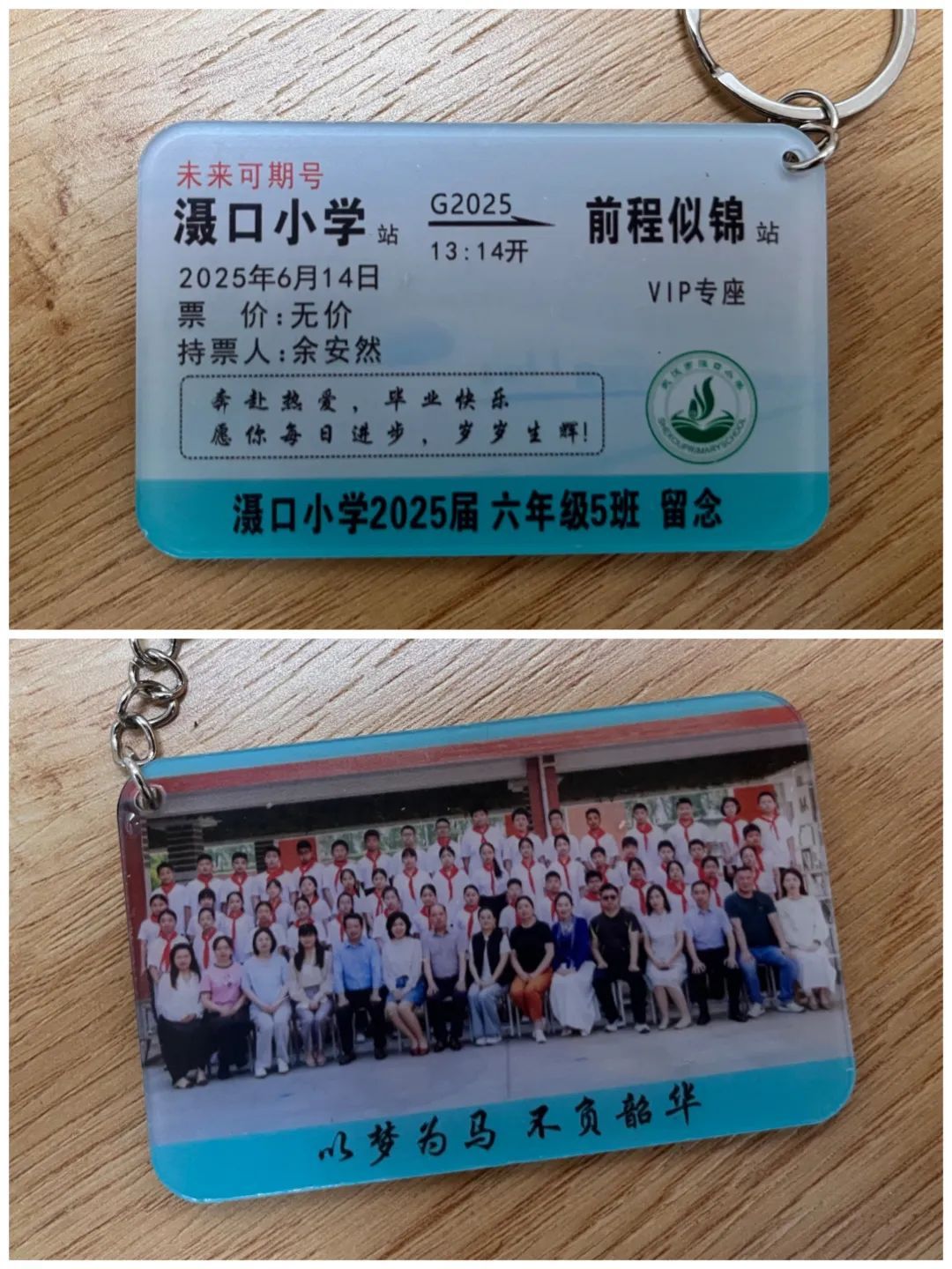 這張“火車票”不簡單,是獨一無二的定制款!這趟車叫“未來可期號”,車次是G2025,從“灄口小學”站開往“前程似錦”站。發(fā)車時間特意定在6月14日13時14分,這是孩子們在校的最后一天,意義非凡!每張票上都印著?;?,持票人是孩子們的名字。票價那一欄寫著“無價”,座位更是“VIP專座”,滿滿都是我對他們的愛和期許!