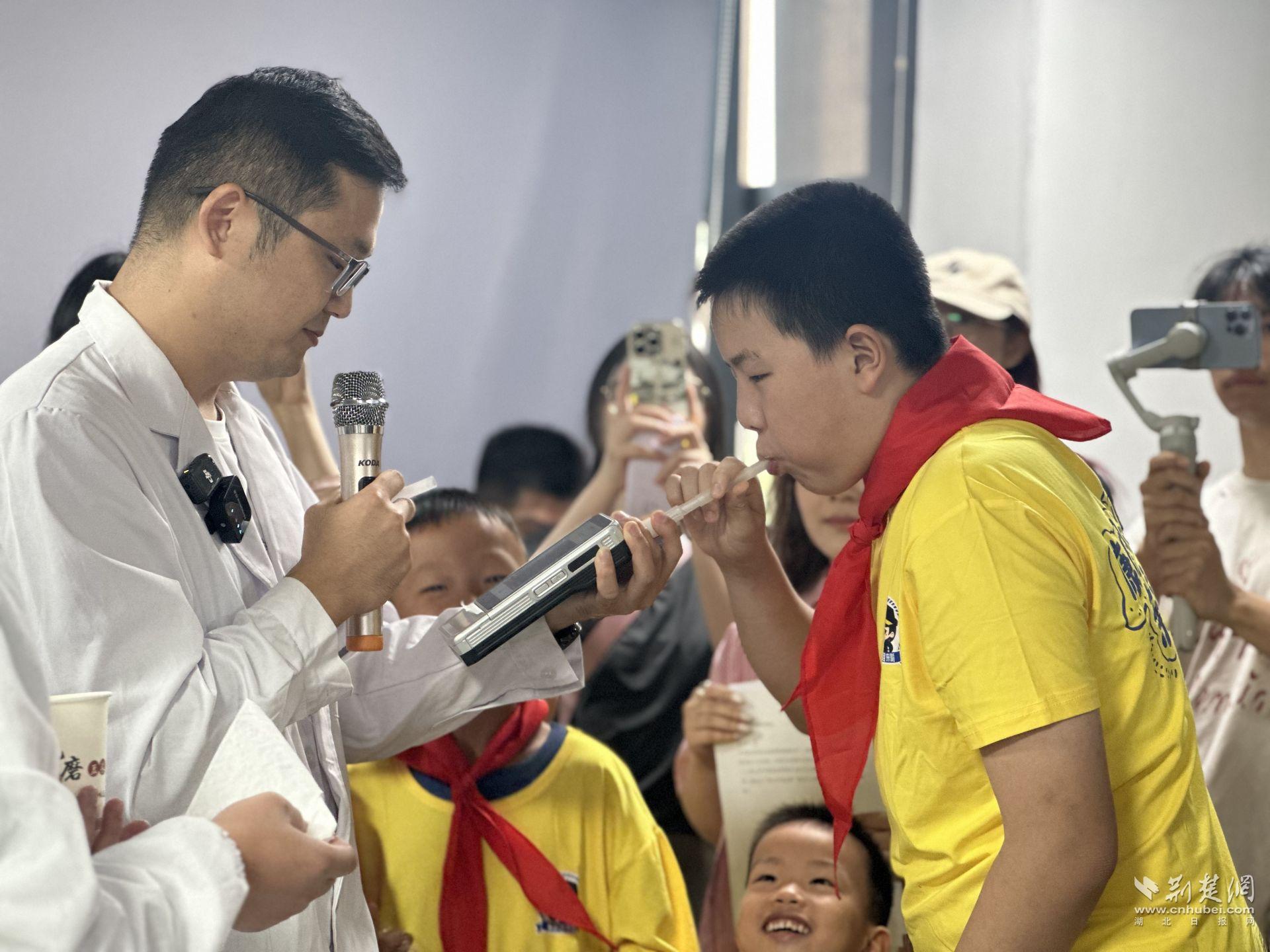 吃蛋黃派會(huì)被算酒駕嗎?在理化實(shí)驗(yàn)室,艾翔、李博文老師通過現(xiàn)場(chǎng)檢測(cè)食用前后的呼氣酒精含量,向家長(zhǎng)和孩子揭示腐乳、格瓦斯等含酒精食品的 “隱形風(fēng)險(xiǎn)”。
