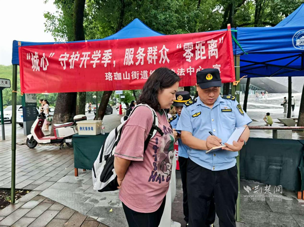 在校內外的兩處宣傳服務點,綜合執(zhí)法中心工作人員不僅發(fā)放法規(guī)宣傳資料,耐心講解市容管理、攤販經(jīng)營等規(guī)定,更主動為新生及家長提供指路、拍照、咨詢等暖心服務。許多新生家庭在宣傳點留下入學第一張合影,執(zhí)法人員熱情擔任“攝影師”,用鏡頭記錄初入珞珈的喜悅瞬間。一位韓國留學生因語言不通在宣傳點求助,執(zhí)法隊員立即手繪詳細地圖并標注路線,幫助其順利找到目的地。留學生用中文連聲道謝,并向隊員豎起大拇指。