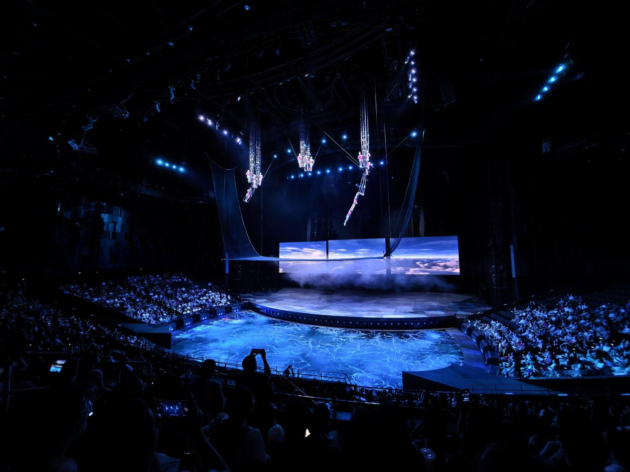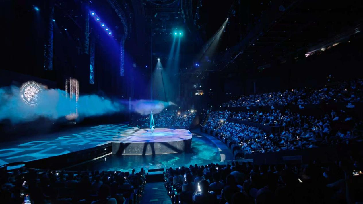 漢秀劇場版《水秀》融合了舞蹈、高空跳水、環(huán)球飛車、空中飛人、吊環(huán)、柔術(shù)等多種藝術(shù)表演形式,演員們?cè)诳罩?、水面和水下穿梭表演,呈現(xiàn)出一系列驚險(xiǎn)刺激、美輪美奐的場景,令臺(tái)下觀眾驚嘆不已,掌聲不斷。
