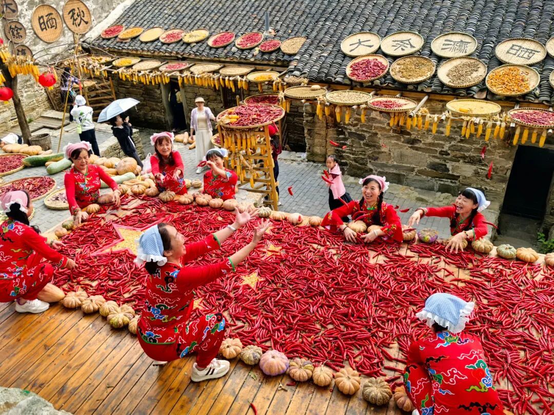 在大余灣,曬秋是鐫刻在石墻黛瓦間的詩意。簸箕托起整個(gè)秋天的饋贈(zèng)——火紅的辣椒、金黃的玉米、橙黃的南瓜、褐色的板栗……層層疊疊鋪展在檐下、院中、屋頂,與明清時(shí)期的古建筑交相輝映,潑灑出中國最生動(dòng)的秋日油畫。
