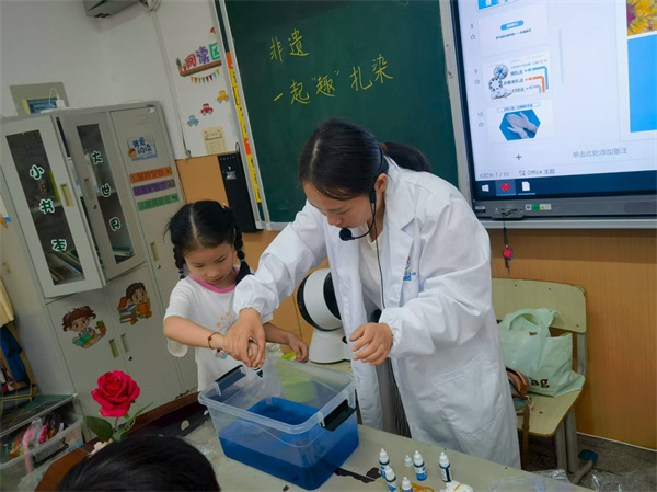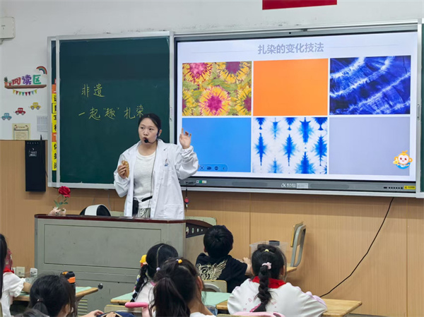 活動現(xiàn)場,科普老師通過趣味講解、實(shí)物展示和互動問答,帶領(lǐng)青少年穿越千年時光,探尋扎染技藝的前世今生。從商周時期的染色起源,到唐宋時期的技法革新,再到明清時期的民俗應(yīng)用,孩子們在生動的圖文資料中觸摸歷史脈絡(luò)?!霸瓉砉糯擞冒逅{(lán)根就能染出這么漂亮的布料!”張雨荷同學(xué)在觀看染色原料展示時驚嘆道。