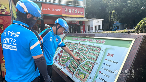 此外,社區(qū)還貼心優(yōu)化配送環(huán)境。小區(qū)出入口立起全景圖立牌,清晰標注配送路線和臨時停車位;主干道增設24個指引牌,44棟樓都裝上了夜光樓棟牌,路口盲區(qū)的凸面反光鏡,守護著小哥的騎行安全。不僅如此,社區(qū)還經常組織小哥們開展活動,盛夏送清涼時,遞上防暑物資;趣味運動會上,一起玩“大錘打氣球”“摸石過河”,歡聲笑語中拉近了彼此的距離。