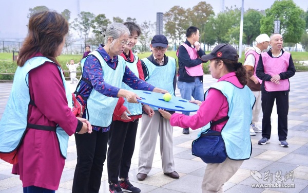 活動現(xiàn)場設(shè)置了三個互動游戲區(qū)域,“不倒森林”游戲中,老人們圍成一圈,默契配合轉(zhuǎn)動長桿;“四平八穩(wěn)”環(huán)節(jié),大家小心翼翼地操控游戲道具,努力保持小球平衡;“同舟共濟(jì)”時,三人一組相擁站在墊子上協(xié)同挪動。這些趣味拓展活動不僅鍛煉了老人們的協(xié)調(diào)能力,更在歡聲笑語中增進(jìn)了鄰里情誼。