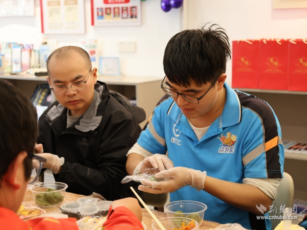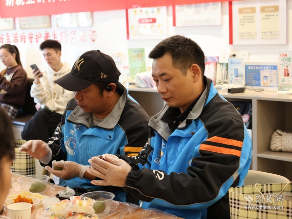 在制作青團(tuán)時(shí),現(xiàn)場(chǎng)同步開展“黃鶴家人茶話會(huì)”,搭建起代際對(duì)話的橋梁。花堤社區(qū)紫陽之星小區(qū)黨支部書記金文芳講述了小區(qū)變遷故事,傳遞長(zhǎng)者對(duì)騎手們的關(guān)懷;新就業(yè)群體入黨積極分子樂倩倩則分享了送餐途中幫扶孤寡老人的暖心經(jīng)歷。兩代人的真誠交流深化了情感共鳴,現(xiàn)場(chǎng)洋溢著家人般的溫暖氛圍。