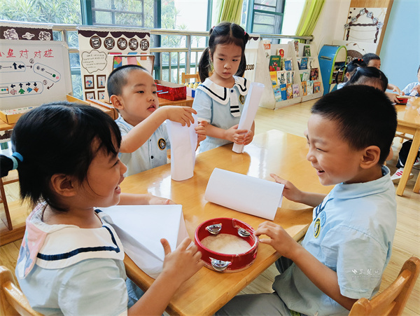 動手環(huán)節(jié)點燃孩子們的熱情,四人一組的小隊伍里,小朋友們手握A4紙、膠帶躍躍欲試,有的反復(fù)卷緊紙張,力求讓紙筒更厚實;有的湊著腦袋和伙伴商量,給紙筒底部貼“小支架”增強穩(wěn)定性。課堂里,剪刀裁剪聲、膠帶粘貼聲伴著小聲討論,專注的小身影構(gòu)成了熱鬧又溫馨的畫面。