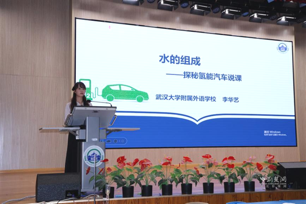 武漢大學附屬外語學校李華藝老師執(zhí)教《水的組成——探秘氫能汽車》展示課。課程以新能源汽車為線索,設計四大項目,學生通過海報、角色扮演等形式展示探究成果。李老師引導學生從宏觀、微觀、符號三重視角認識水的組成,最終用電解產(chǎn)生的氫能讓小車現(xiàn)場行駛,實現(xiàn)化學與科技的有機融合。說課環(huán)節(jié)中,她介紹項目圍繞“氫能汽車如何工作”展開,借助AI模擬生產(chǎn)過程,讓學生感受化學的實踐價值。