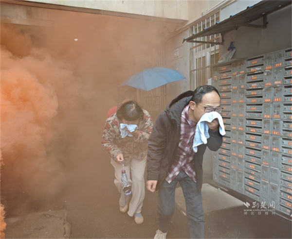隨后,6棟居民樓模擬火災(zāi)疏散演練啟動?!盁熿F彈點燃!滅火組壓制初期火源,疏散組組織撤離!”指令下達后,滅火組迅速攜帶器材沖進樓道撲救模擬起火點;疏散組手持熒光指揮棒,在樓層樓梯口、轉(zhuǎn)角處布控,引導居民彎腰捂鼻、有序撤離。