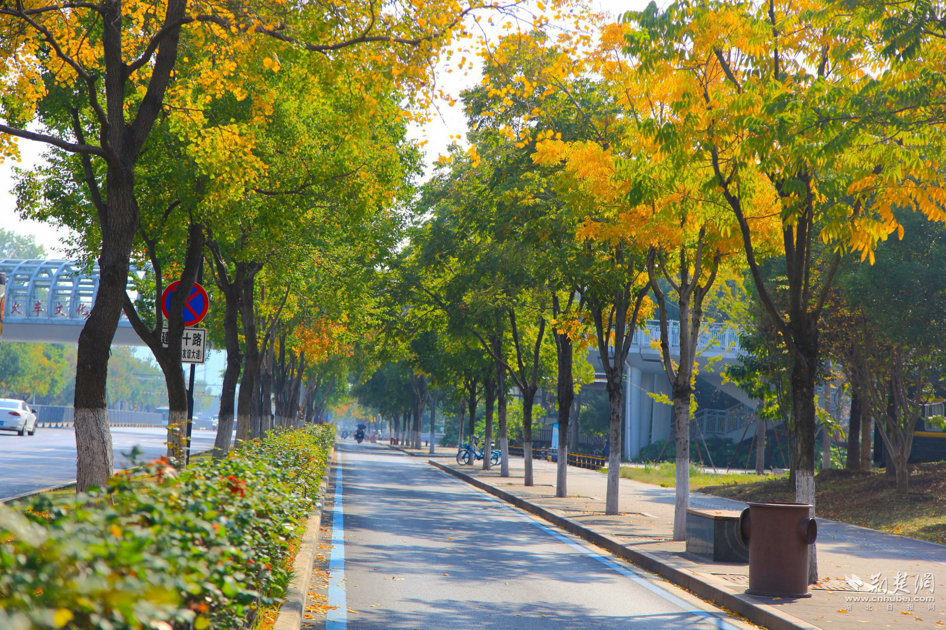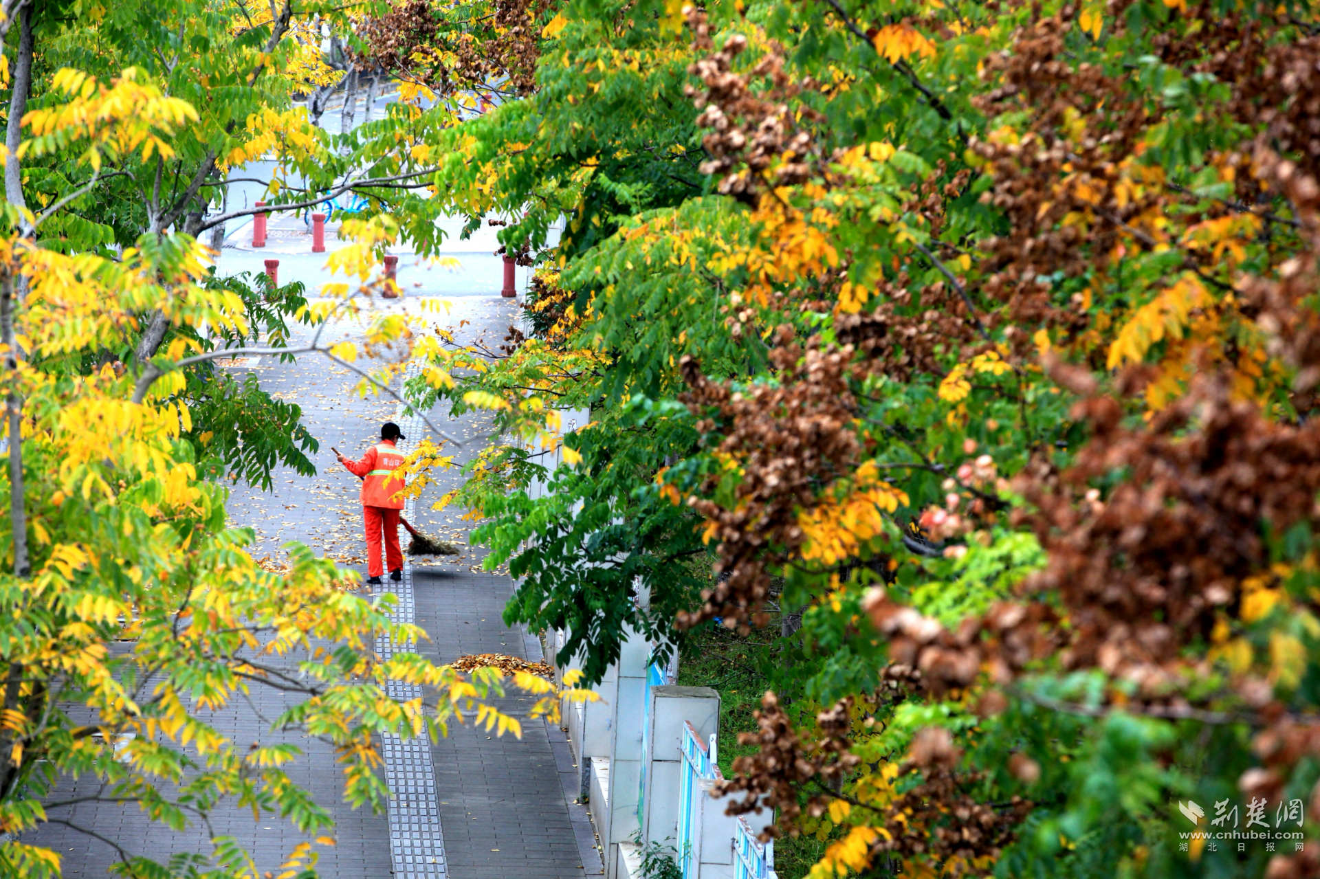 荊楚網(wǎng)(湖北日?qǐng)?bào)網(wǎng))訊(記者 何婧 通訊員 杜媛媛 呂學(xué)勇 張忱)近日,武漢市青山區(qū)建設(shè)十路迎來了一年中最絢爛的時(shí)刻:無患子金黃璀璨,烏桕深紅如焰,斑斕色彩與沿途公園、綠道共同勾勒動(dòng)人的城市生態(tài)畫卷,吸引市民駐足打卡。
