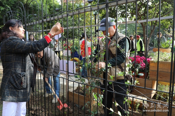 武昌區(qū)黃鶴樓街道西廠口社區(qū)園藝師張?。ㄓ遥┞槔貙⒅l固定在花架上。 通訊員供圖