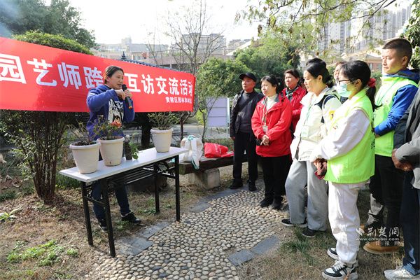 當(dāng)天,社區(qū)園藝師跨區(qū)互訪交流活動在沙港社區(qū)舉行,來自全市各區(qū)的28名社區(qū)園藝師與沙港社區(qū)志愿者,通過實地探訪、動手實操、互動分享,圍繞社區(qū)花墻打造、秋冬季病蟲害防治等話題展開深度交流,在互學(xué)互鑒中共同提升園藝服務(wù)水平。