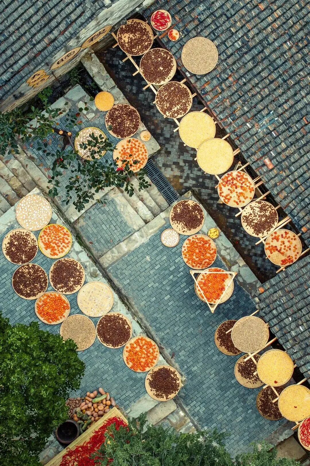 1.古村屋頂平拍農(nóng)作物在陽光下鋪展的鮮活感。