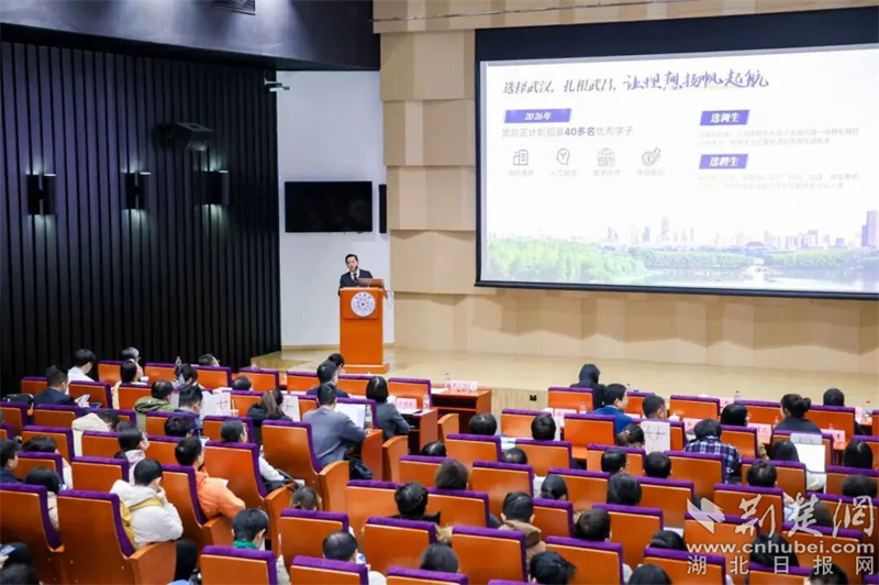 在用人單位推介環(huán)節(jié),武昌區(qū)委常委、組織部部長(zhǎng)施國(guó)宏以《三生有幸 筑夢(mèng)江城》為題,從“歷史底蘊(yùn)”“現(xiàn)代產(chǎn)業(yè)”和“生態(tài)宜居”等維度,介紹了武昌作為武漢重要城區(qū)的獨(dú)特魅力——從黃鶴樓的千年文化到長(zhǎng)江沿岸的現(xiàn)代樓宇經(jīng)濟(jì),從東湖綠道的生態(tài)長(zhǎng)廊到“環(huán)沙湖經(jīng)濟(jì)帶”的創(chuàng)新活力,一個(gè)開放包容、充滿機(jī)遇的武昌形象吸引了在場(chǎng)眾多學(xué)子。
