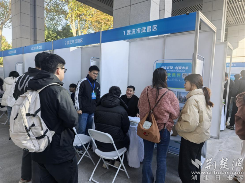 應(yīng)屆畢業(yè)學(xué)子在武昌區(qū)展臺(tái)前了解咨詢政策。