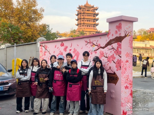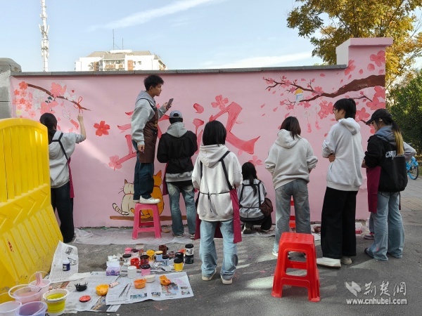 活動首日,志愿者們早早來到現(xiàn)場,分工協(xié)作完成物料搬運、防護鋪設等準備工作。隨著畫筆起落,原本單調的灰墻被溫柔的粉色調漸漸覆蓋,“武漢”兩個大字輪廓清晰浮現(xiàn),兩側櫻花枝椏初現(xiàn)雛形。在冬日的暖陽下,志愿者們俯身勾勒、抬手描繪,讓冰冷墻面開始煥發(fā)浪漫生機。