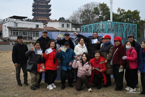 快閃活動(dòng)選址社區(qū)黃鶴游園,抬頭即見巍巍黃鶴樓。現(xiàn)場(chǎng),82歲守井人謝邦純老人與社區(qū)工作人員、青年學(xué)子一同講述“三井一臺(tái)”的故事,帶領(lǐng)在場(chǎng)居民穿越時(shí)空,觸摸楚王府遺韻與市井生活記憶。