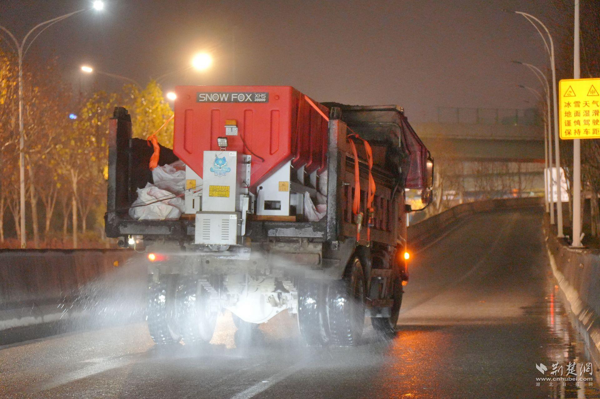 指令發(fā)出后,一線力量迅速到位。22時左右,硚孝高速匝道口,區(qū)服投臨空港市政環(huán)衛(wèi)公司的三臺融雪劑撒布機同步作業(yè)。融雪劑被均勻鋪撒在匝道和橋面,為后續(xù)可能出現(xiàn)的結冰提前“打底”。