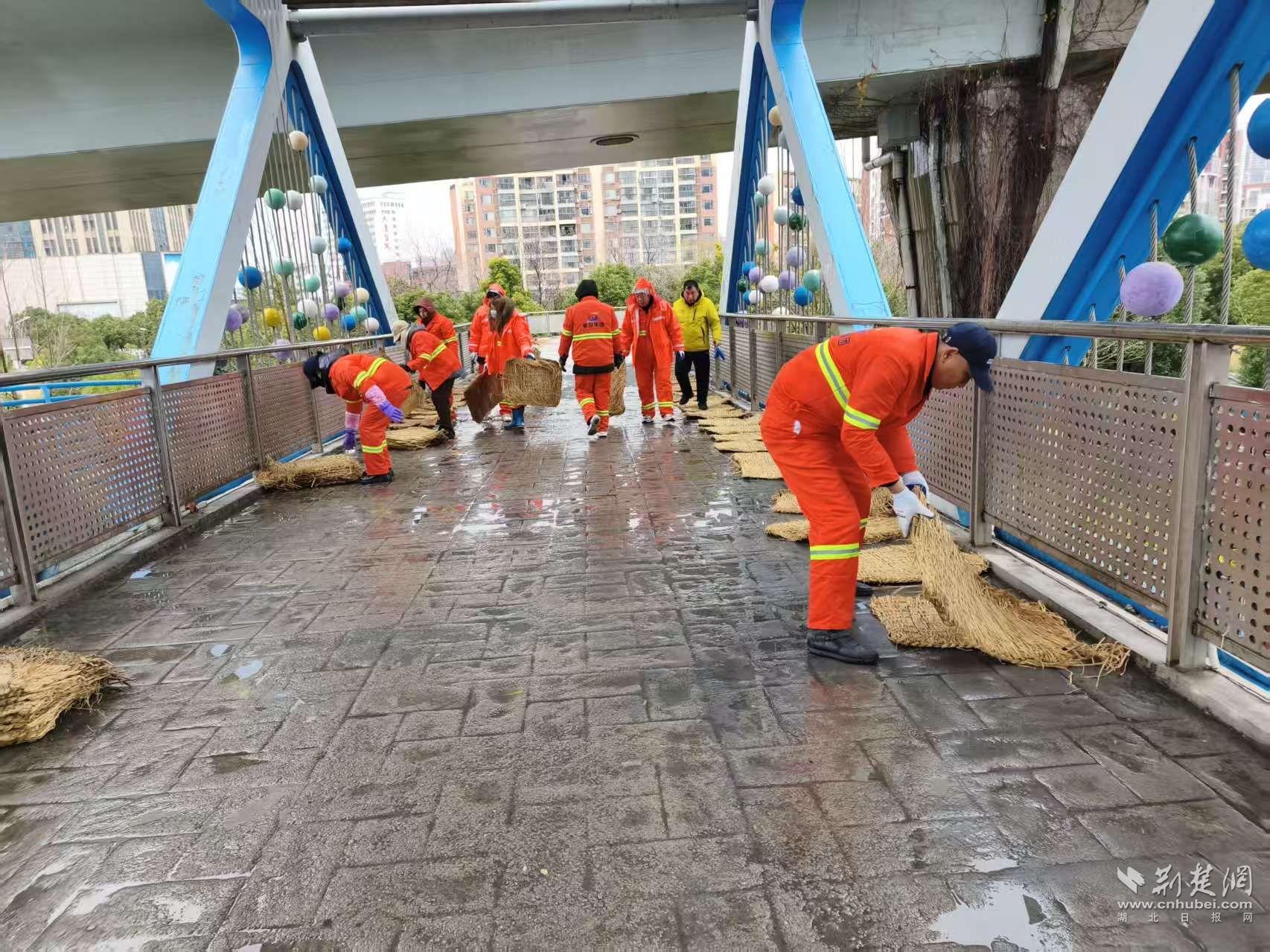 防滑措施同樣向行人集中區(qū)域延伸。19日17時起,吳家山環(huán)山路人行天橋上,環(huán)衛(wèi)工人與執(zhí)法隊員開始鋪設防滑草墊。“橋兩側是學校,晚高峰和早高峰人流集中,提前鋪設能減少滑倒風險?!眳羌疑浇志C合執(zhí)法中心副主任陳偉說。