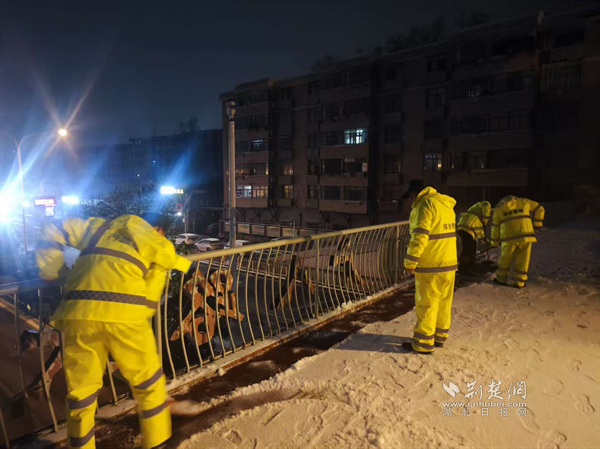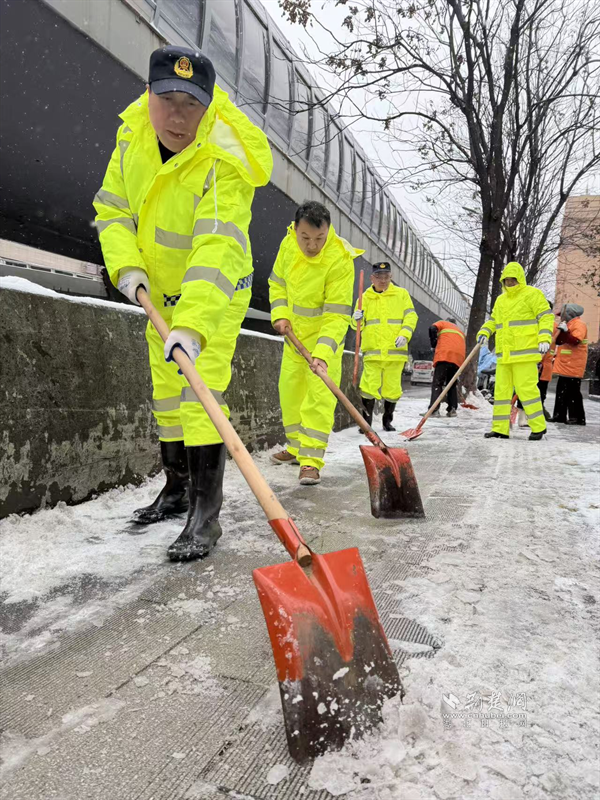 1月19日深夜至20日凌晨,隨著雪勢加大,街道應(yīng)急搶險隊伍迅速化身“風(fēng)雪夜行人”,頂著嚴(yán)寒奔赴一線。他們采取機(jī)械作業(yè)與人工作業(yè)相結(jié)合的方式,對轄區(qū)主次干道、橋梁、陡坡、十字路口等重點(diǎn)路段和易結(jié)冰區(qū)域,進(jìn)行循環(huán)撒布融雪鹽和清掃作業(yè),最大限度預(yù)防道路結(jié)冰。寒夜中,隊員們衣衫被雪花浸濕,臉頰被寒風(fēng)凍紅,但無人退縮,持續(xù)堅守。天色微明,雪勢稍歇,隊伍立即轉(zhuǎn)戰(zhàn),對背街小巷、人行道、天橋等區(qū)域的殘留積雪進(jìn)行清理,并在坡道、臺階等易滑處鋪設(shè)防滑草墊、設(shè)置警示標(biāo)識,全力保障早高峰出行安全順暢。