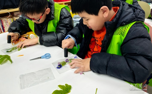 “童心造紙術(shù)·愛(ài)心拓染坊”課程把非遺技藝帶進(jìn)課堂。孩子們親手體驗(yàn)古法造紙,并用采集的桂花葉、香樟葉進(jìn)行植物拓染,將自然的紋理留存在紙上。這些拓印作品被精心制作成新年書(shū)簽,成為送給家人的“有溫度的禮物”。
