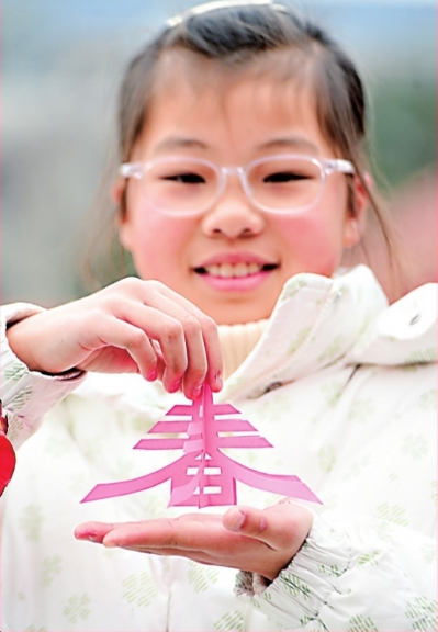免費領(lǐng)取新春剪紙后,小朋友迫不及待展示。