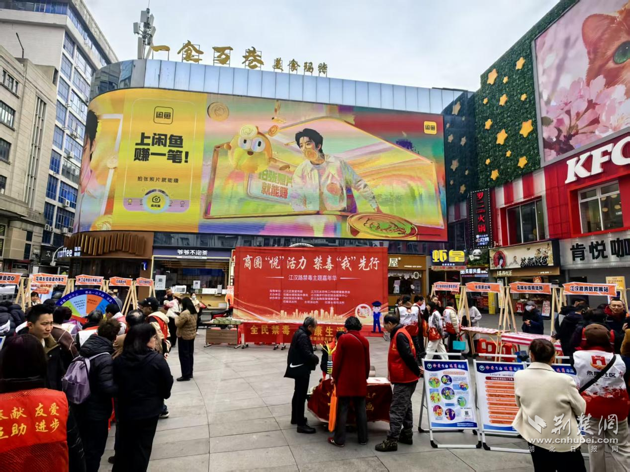 當(dāng)天上午,江漢路步行街中心廣場(chǎng)人流如織,一場(chǎng)以“商圈‘悅’活力 禁毒‘我’先行”為主題的禁毒嘉年華活動(dòng)熱鬧開啟?;顒?dòng)以互動(dòng)體驗(yàn)為核心,創(chuàng)新推出“5大現(xiàn)場(chǎng)互動(dòng)板塊”和“1個(gè)流動(dòng)宣傳矩陣”,將禁毒知識(shí)巧妙融入游戲、非遺文化和民生服務(wù)中,吸引大量市民游客參與。