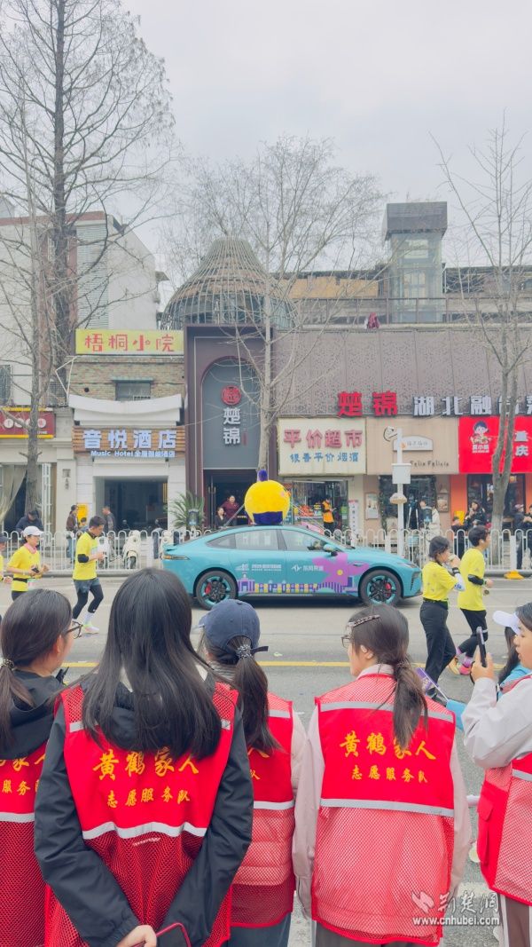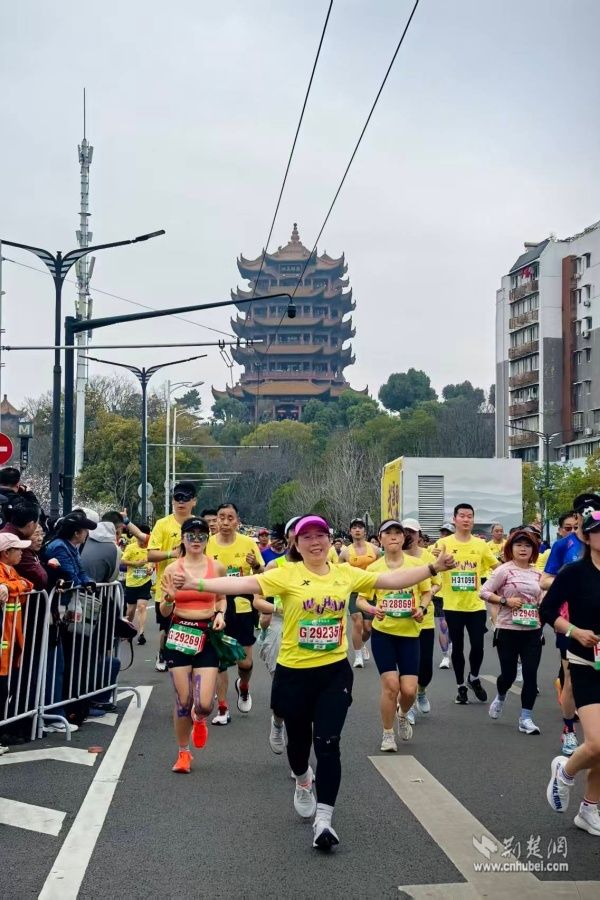 隨著發(fā)令槍響,跑者們?nèi)绯彼阌縼?。?dāng)?shù)谝惶蓐?duì)經(jīng)過黃鶴樓腳下時(shí),賽道兩側(cè)瞬間沸騰。吶喊聲、加油聲此起彼伏,街道工作人員和居民志愿者們揮舞著手臂,用最飽滿的熱情為每一位跑者鼓勁助威。