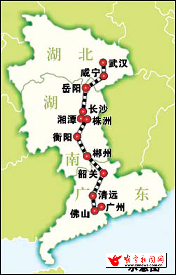 武廣高速鐵路是我國2005年開工的線路最長、投資最大的客運專線,北起武漢新火車站,途經(jīng)江夏、咸寧、岳陽、長沙、株洲、衡陽、郴州、韶關(guān)、清遠和花都,南到番禺的廣州新火車站,全長995公里,總投資約1166億元。該鐵路建設創(chuàng)造和打破了中國世界紀錄協(xié)會多項世界之最、中國之最。