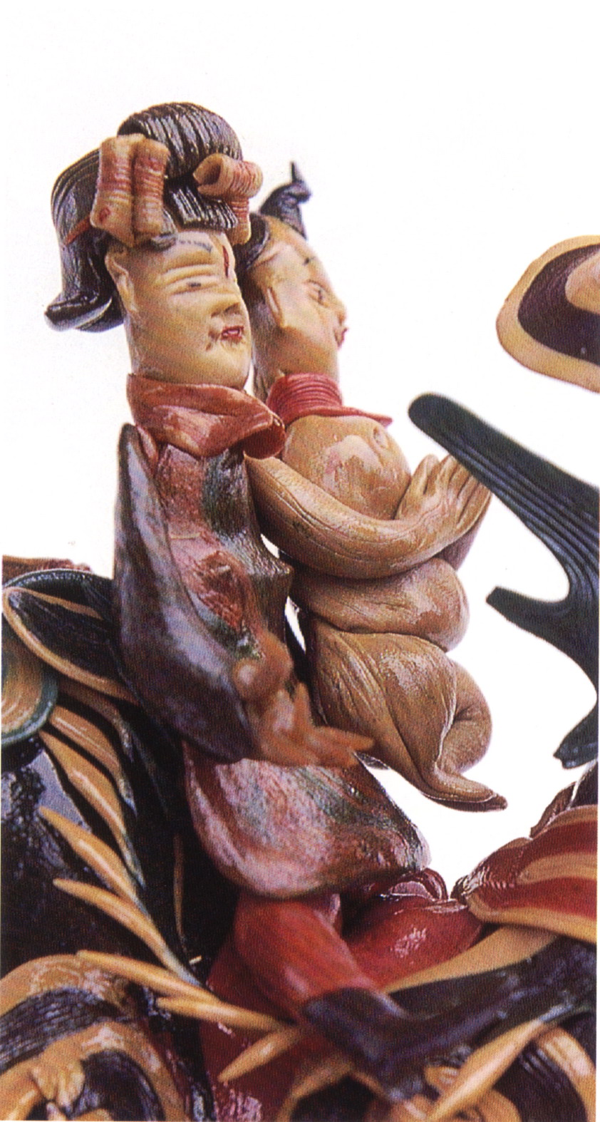 糖塑,俗稱吹糖,在湖北遍及全省,尤以天門最為突出。糖塑之所以贏得人們的喜愛,是因?yàn)樗?dú)具特色:1、原料可塑性強(qiáng):麥芽糖是糖塑的主要原料,加熱后變軟,比面塑更具可塑性,既可吹成薄而亮的各類造型,又可拉成粗細(xì)不同的糖絲。捏成不同形狀的配件,易粘且牢固;2、造型神形兼?zhèn)洌禾撬艿募妓囍饕Ψ蛟凇按怠鄙,一塊糖坯在藝人手中,邊吹邊捏,再通過搓、壓、挑、剪等手段,加上輔助的小鐵絲,少則幾分鐘,多則半小時(shí),一件作品就完成了;3、色彩和諧醒目:麥芽糖加溫變軟加入紅、綠、黃、黑四種色素,根據(jù)需要又可調(diào)和成數(shù)十種復(fù)色,色彩響亮和諧;4、肌理變化豐富是糖塑獨(dú)具的特點(diǎn):在糖塑中,附件變化萬千的肌理又與主體吹成光滑的表面形成鮮明的對比,顯得更加豐富耐看;5、“活”的部件是糖塑的又一特點(diǎn):有的部件裝上自制的鋼絲彈簧,一經(jīng)拿在手中,部件都“活”起來了,更具生氣。